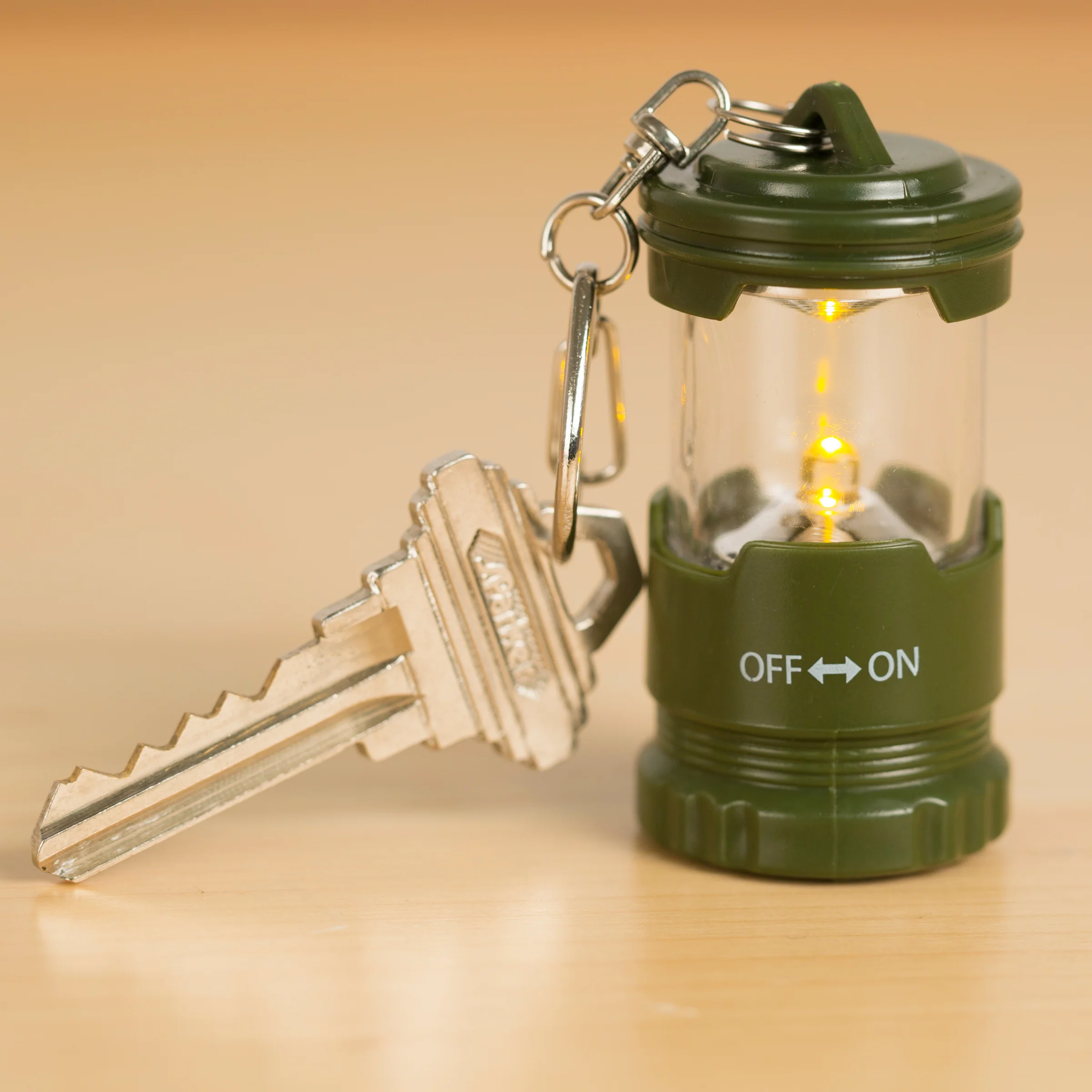 This classic “camping lantern” style keychain will help guide you throug the dark. Twist base to turn on/off. Batteries included.